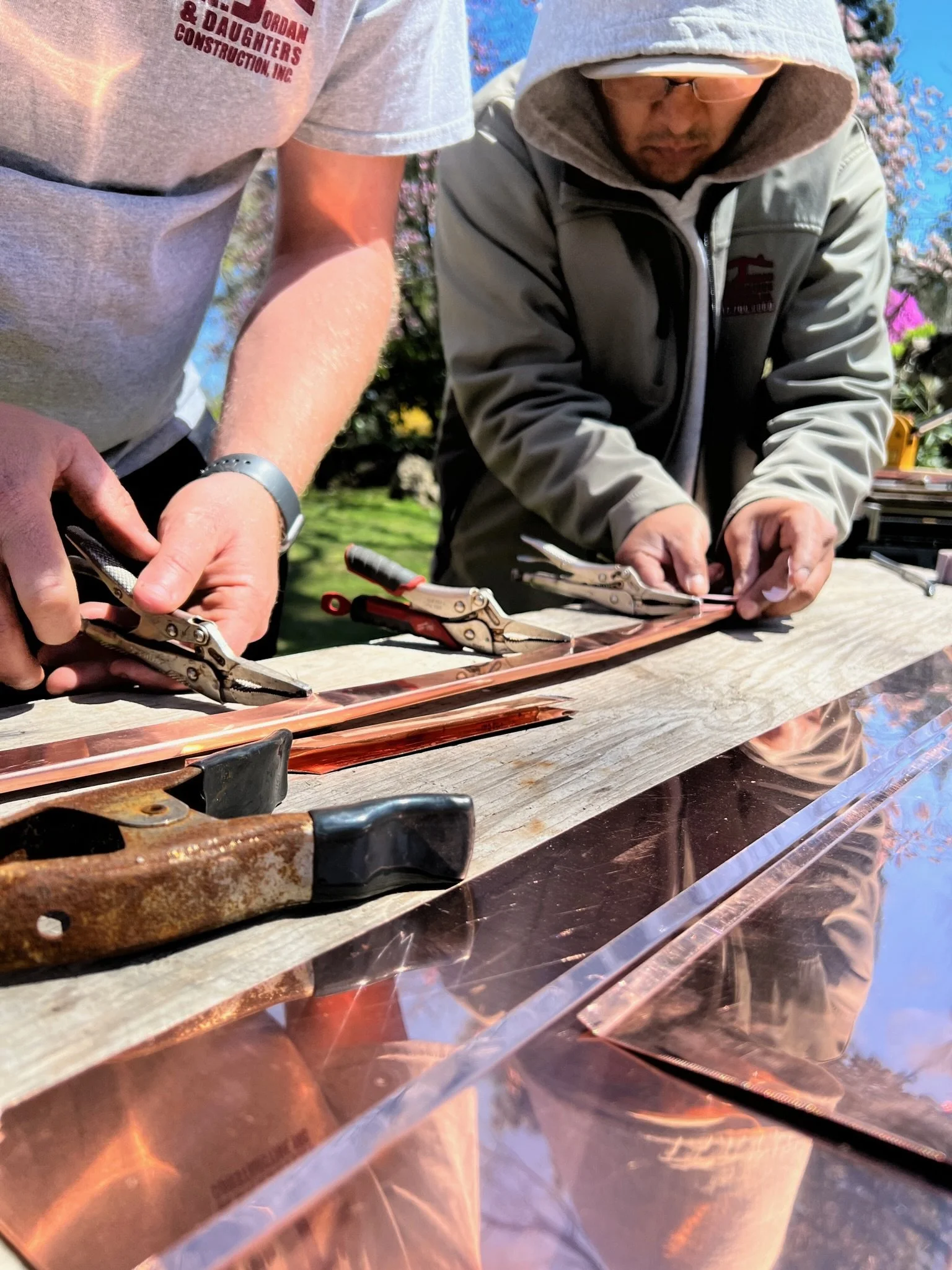 Back in the present, our teammates replacing the copper designed a three-part flashing system for the spines that could be fit to the shape of the roof, joints soldiered and riveted to the steel spines. The new flashing for the storm panel was designed to improve venting and allow it to be removed for cleaning.